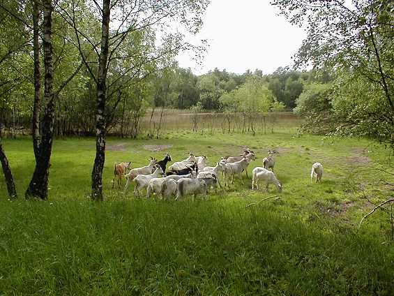 Landschaftspflege: Grube Weiß (Bergisch Gladbach)![]() ![]() Photos: Carsten Mai Ziegen weiden für den Naturschutz Seit 2002 werden in der Grube Weiß Ziegen in der Landschaftspflege eingesetzt. Ihre Aufgabe ist es, die Verbuschung und Bewaldung des FFH-Gebietes aufzuhalten und für eine Erweiterung der waldfreien Flächen zu sorgen. Dies ist notwendig, weil Gelbbauchunken und viele andere in der Grube Weiß lebende seltene Tier- und Pflanzenarten sonnige, warme Lebensräume benötigen. Nach der Stillegung der Grube Weiß eroberte innerhalb weniger Jahrzehnte der Wald fast alle ehemals völlig vegetationslosen Grubenbereiche. Durch diese Entwicklung verloren zahlreiche spezialisierte Arten ihre Lebensräume. Das Bemühen, die fortschreitende Bewaldung per Hand aufzuhalten, scheiterte an fehlenden Arbeitskräften, an finanziellen Möglichkeiten und letztlich an der Geschwindigkeit, mit der die jungen Gehölze aufwuchsen. Ziegen fressen mit Vorliebe Blätter, junge Äste und auch Rinde von Büschen und Bäumen und sind daher für die Entbuschungsarbeit besonders geeignet. Junge Bäume werden durch ständigen Verbiß am Weiterwachsen gehindert und sterben schließlich ab. Auch viele ältere Gehölze werden durch Abschälen der Rinde zum Absterben gebracht. Brechen durch Sturm oder Schneebruch Bäume um, verhindern die Ziegen den Jungwuchs in der entstandenen Lücke und erhalten diese dadurch. Durch ständiges Belaufen bleiben steile Böschungen frei von Bewuchs und dem Sonnenlicht voll ausgesetzt. Dabei wirkt die Anwesenheit der Ziegen auf die Wildtiere der Grube Weiß nicht als Störung, wie es etwa bei Waldarbeitern mit Motorsägen der Fall wäre und es entsteht kein aufwendig zu entsorgender Abfall.